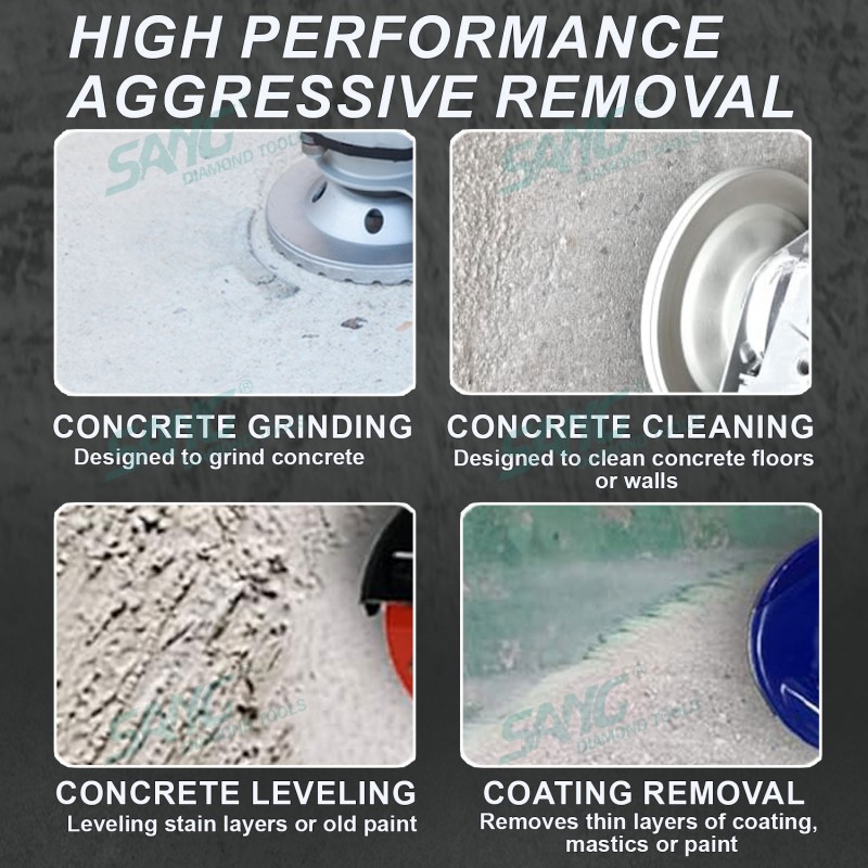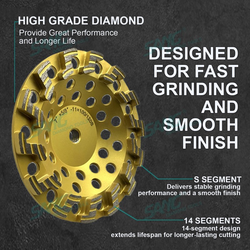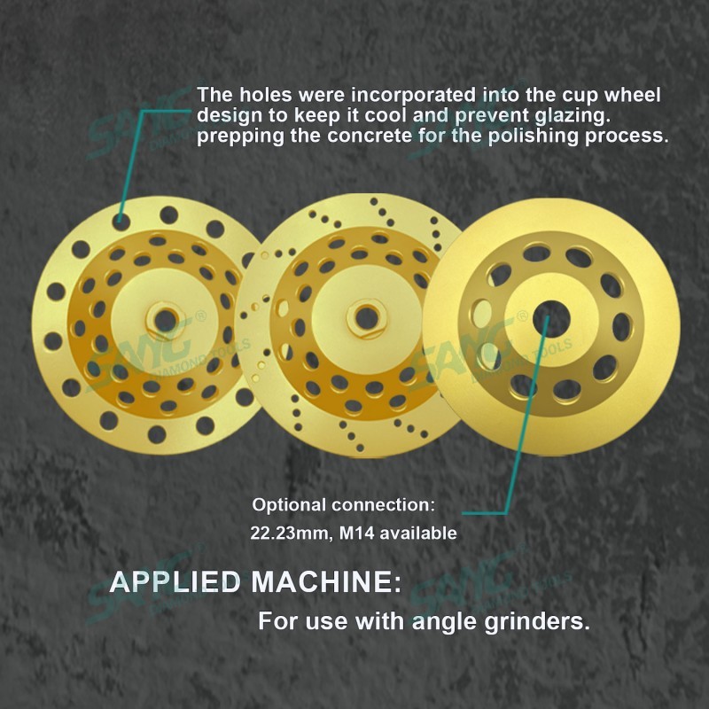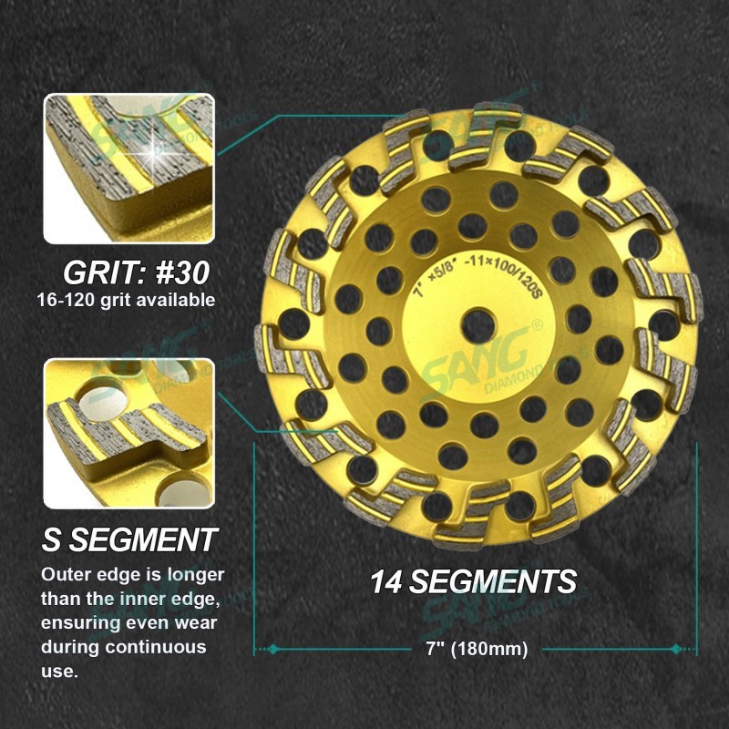 Śpiewał diamentowe koło kubka używany do uroku, ukosowania i szlifowania krawędzi kamienia i betonu oraz powierzchnia. ziarnistość: 36 #, 46 #, 60 #, 80 #, 100 #, 120 #, 200 # istnieje uniwersalne połączenie od 150 mm (22,23 / m14)