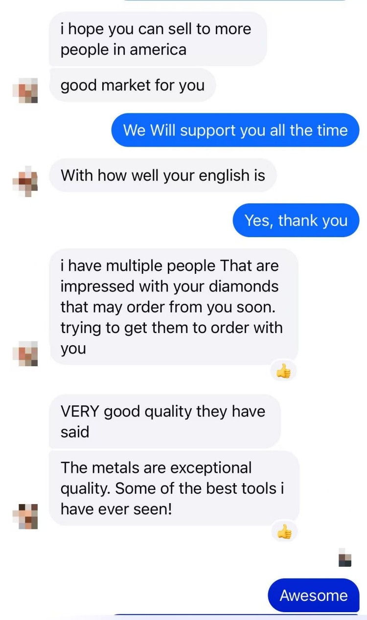 „Mam kilka osób, które są pod wrażeniem waszych diamentów i mogą wkrótce u was złożyć zamówienie. Staram się, żeby złożyły u was zamówienie.”